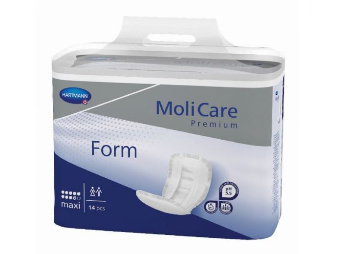 A pad for severe incontinence that is shaped to fit perfectly to the body. MoliCare Premium Form offers maximum leakage protection with a 3 layer absorbent core that helps keep the skin dry and pH balanced to lower the risk of incontinence related skin irritation. The soft textile-like fabric provides discretion and maximum wearing comfort. Worn with MoliCare Premium Fixpants.